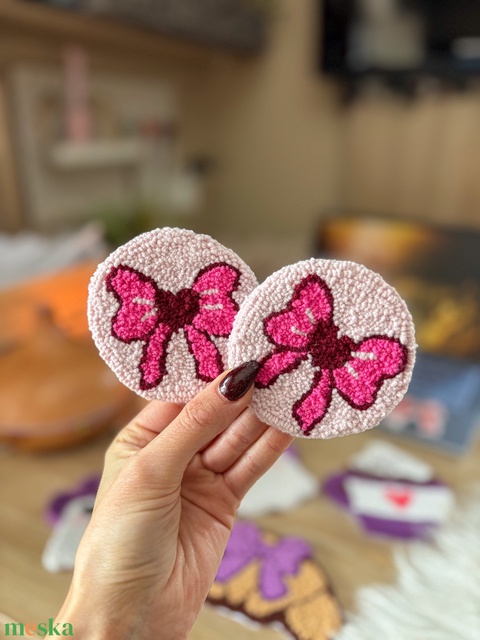 Hímzett autós poháralátét, szíves masni