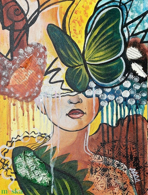 - Anyaga: vászon, akrilfesték, lakk, dekorpapír