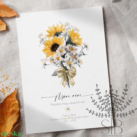 Köszönőajándék óvó néniknek, dadusoknak, napraforgó csokor mintás ovis ballagási búcsúajándék, ajándékkísérő
