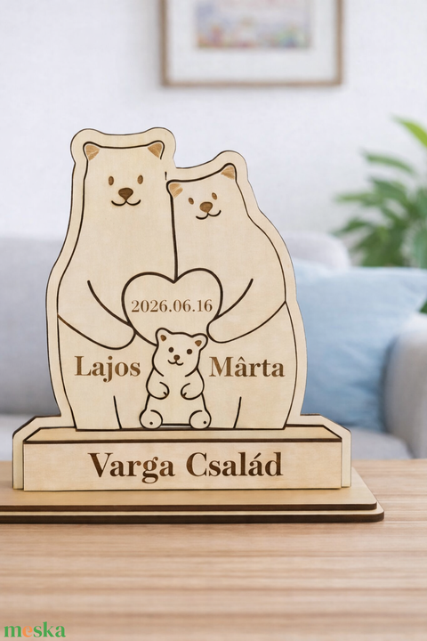 Egyedi gravírozott fa maci család – személyes ajándék szívből ✨