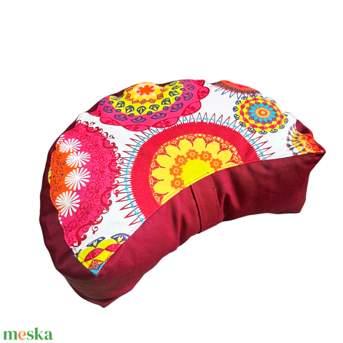 Meditációs félhold, jóga ülőpárna tönköly pelyvával töltve, bordó-szines mandalás
