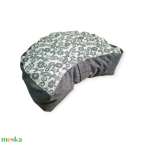 Meditációs félhold, jóga ülőpárna tönköly pelyvával töltve, szürke, kasmír mintás