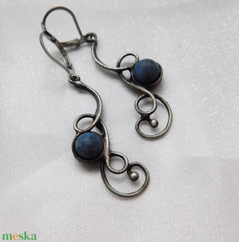 A fülbevaló tiffany technikával készült szodalit gyöngyök, réz és ólommentes, ezüsttartalmú ón felhasználásával. A díszítés szintén saját készítésű, nem tartalmaz gyári elemeket. A díszítés szintén saját készítésű, nem tartalmaz gyári elemeket.A fémrészt óezüstre patináztam és lelakkoztam, hogy sokáig szép maradjon.