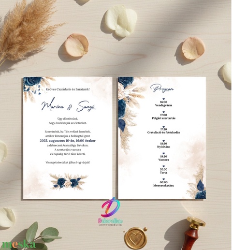 Elegáns pampás nyomtatott esküvői meghívó ❤️ MINIMUM MEGRENDELÉS-8DB A gyártás zökkenőmentes lebonyolítása és a magas minőség biztosítása érdekében a rendelés minimális darabszáma 8 darab. ❤️ PAPÍRVÁLASZTÉK * A meghívó kétféle l, gondosan válogatott 250g-os, merevebb papíron készül, hogy a stílusotokhoz és költségvetésetekhez igazodjon: - Sima fehér karton – letisztult, merev, kiváló ár-érték arányú alapváltozat - Textúrált kreatív karton – enyhén rusztikus, természetes felületű papír, különleges, finoman barázdált tapintással *** A papírtípust a rendelésnél a legördülő menüből tudod kiválasztani. Minden opció kiváló minőségű, kézbe véve is igényes megjelenést biztosít, de a meghívó grafikájához leginkább a finoman barázdált kartont javaslom. ❤️ VIASZPECSÉT * Színek a legördülő menüből választhatók, mintákat a képek között találsz * Ha szeretnél viaszpecsétet, a rendeléskor a megjegyzésben add meg a számát. ❤️ FIZETÉS Utánvételre és bankkártyás fizetésre nincs lehetőség egyik szállítási módnál sem. A megrendelés ellenértékét átutalással, vagy személyesen, az Erste Bank fiókjaiban történő pénztári befizetéssel tudod kiegyenlíteni, a számla alapján. ❤️ MÉRET * 105 × 148 mm (A6), 1 oldalas kivitel * Kézbe simuló, figyelemfelkeltő forma *** További kivitelezési opciókat a legördülű lehetőségek közt találsz ha elérhető az adott terméknél. ❤️ DESIGN A meghívó letisztult, ízléses megjelenését a részletek gondos kidolgozása és az egységes arculat garantálja. Az egyedi grafikai elemek és harmonikus tipográfia támogatják, hogy a meghívó tökéletesen illeszkedjen az esemény stílusához és az egyéni elképzelésekhez. ❤️ NYOMTATOTT OLDALAK Teljesen személyre szabható szövegezés: dátum, helyszín, idézet, program. A meghívó nyomtatott oldalai teljes mértékben testreszabhatók – a szövegezés, elrendezés és tartalom igény szerint alakítható, hogy tökéletesen illeszkedjen a Te eseményed hangulatához és stílusához. ❤️ EXTRA LEHETŐSÉGEK Kiegészítő termékek széles választéka áll rendelkezésre, mint például borítékok, szalagok, viaszpecsétek amelyek egységes megjelenést biztosítanak az eseményhez, és tovább emelik a meghívó egyediségét. ❤️ FONTOS * A képeken látható borítékok, viaszpecsétek és kiegészítők dekorációs célt szolgálnak, nem az alapajánlat részei és nem pont ilyen színűek. * A monitoron megjelenő színek eltérhetnek a valós terméktől * Az ár 1 db, 2 oldalas meghívóra vonatkozik, boríték és kiegészítők nélkül. ❤️ RENDELÉS MENETE ÉS ELKÉSZÍTÉS LÉPÉSEI !!!VÁSÁRLÁSKOR FOKOZOZTAN FIGYELJ, HOGY AZ E-MAIL CÍMED HELYESEN LEGYEN MEGADVA!!! * Tedd a kosárba a kívánt darabszámban a meghívót és választott kiegészítőt (min. 8db) * E-mailben küldd el a szöveget (dátum, nevek, helyszín stb.) * Látványtervet küldök e-mailben, jóváhagyás és fizetés után indítom a gyártást * Két alkalommal díjmentesen módosítható a látványterv (szöveg, elrendezés) * A gyártás a számla szerinti összeg beérkezése után kezdődik, átfutási idő kb. 5-7 munkanap ❤️ A Meskás visszaigazolásban találod az elérhetőségem, kérlek, oda küldd a megrendeléssel kapcsolatos üzenetedet. Ellenőrizd a spam mappát is, ha nem kapsz választ 1-2 napon belül!