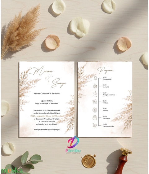 Elegáns pampás nyomtatott esküvői meghívó ❤️ MINIMUM MEGRENDELÉS-8DB A gyártás zökkenőmentes lebonyolítása és a magas minőség biztosítása érdekében a rendelés minimális darabszáma 8 darab. ❤️ PAPÍRVÁLASZTÉK * A meghívó kétféle l, gondosan válogatott 250g-os, merevebb papíron készül, hogy a stílusotokhoz és költségvetésetekhez igazodjon: - Sima fehér karton – letisztult, merev, kiváló ár-érték arányú alapváltozat - Textúrált kreatív karton – enyhén rusztikus, természetes felületű papír, különleges, finoman barázdált tapintással *** A papírtípust a rendelésnél a legördülő menüből tudod kiválasztani. Minden opció kiváló minőségű, kézbe véve is igényes megjelenést biztosít, de a meghívó grafikájához leginkább a finoman barázdált kartont javaslom. ❤️ VIASZPECSÉT * Színek a legördülő menüből választhatók, mintákat a képek között találsz * Ha szeretnél viaszpecsétet, a rendeléskor a megjegyzésben add meg a számát. ❤️ FIZETÉS Utánvételre és bankkártyás fizetésre nincs lehetőség egyik szállítási módnál sem. A megrendelés ellenértékét átutalással, vagy személyesen, az Erste Bank fiókjaiban történő pénztári befizetéssel tudod kiegyenlíteni, a számla alapján. ❤️ MÉRET * 105 × 148 mm (A6), 1 oldalas kivitel * Kézbe simuló, figyelemfelkeltő forma *** További kivitelezési opciókat a legördülű lehetőségek közt találsz ha elérhető az adott terméknél. ❤️ DESIGN A meghívó letisztult, ízléses megjelenését a részletek gondos kidolgozása és az egységes arculat garantálja. Az egyedi grafikai elemek és harmonikus tipográfia támogatják, hogy a meghívó tökéletesen illeszkedjen az esemény stílusához és az egyéni elképzelésekhez. ❤️ NYOMTATOTT OLDALAK Teljesen személyre szabható szövegezés: dátum, helyszín, idézet, program. A meghívó nyomtatott oldalai teljes mértékben testreszabhatók – a szövegezés, elrendezés és tartalom igény szerint alakítható, hogy tökéletesen illeszkedjen a Te eseményed hangulatához és stílusához. ❤️ EXTRA LEHETŐSÉGEK Kiegészítő termékek széles választéka áll rendelkezésre, mint például borítékok, szalagok, viaszpecsétek amelyek egységes megjelenést biztosítanak az eseményhez, és tovább emelik a meghívó egyediségét. ❤️ FONTOS * A képeken látható borítékok, viaszpecsétek és kiegészítők dekorációs célt szolgálnak, nem az alapajánlat részei és nem pont ilyen színűek. * A monitoron megjelenő színek eltérhetnek a valós terméktől * Az ár 1 db, 2 oldalas meghívóra vonatkozik, boríték és kiegészítők nélkül. ❤️ RENDELÉS MENETE ÉS ELKÉSZÍTÉS LÉPÉSEI !!!VÁSÁRLÁSKOR FOKOZOZTAN FIGYELJ, HOGY AZ E-MAIL CÍMED HELYESEN LEGYEN MEGADVA!!! * Tedd a kosárba a kívánt darabszámban a meghívót és választott kiegészítőt (min. 8db) * E-mailben küldd el a szöveget (dátum, nevek, helyszín stb.) * Látványtervet küldök e-mailben, jóváhagyás és fizetés után indítom a gyártást * Két alkalommal díjmentesen módosítható a látványterv (szöveg, elrendezés) * A gyártás a számla szerinti összeg beérkezése után kezdődik, átfutási idő kb. 5-7 munkanap ❤️ A Meskás visszaigazolásban találod az elérhetőségem, kérlek, oda küldd a megrendeléssel kapcsolatos üzenetedet. Ellenőrizd a spam mappát is, ha nem kapsz választ 1-2 napon belül!