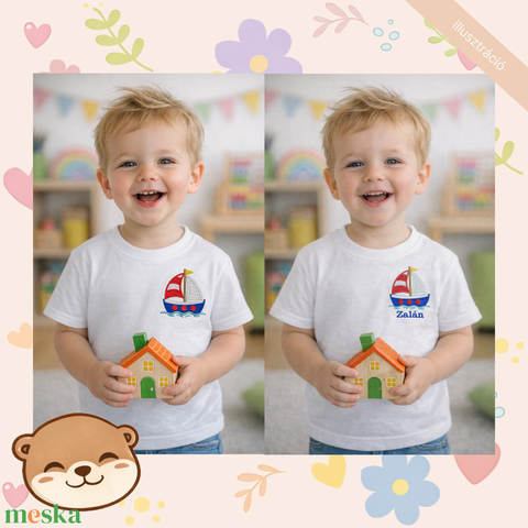 Kérésedre +1000 Ft felárért a gyermek neve is kérhető, amelyet a minta alá hímzünk a mintához passzoló színben – így a póló igazán személyessé válik.