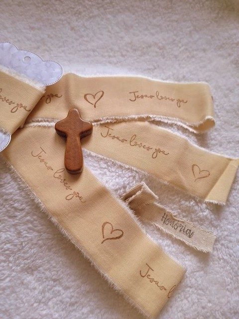 Kézzel festett és bélyegzett, tépett, pamutszalag, Bibliai, igés, felirattal- krém-017