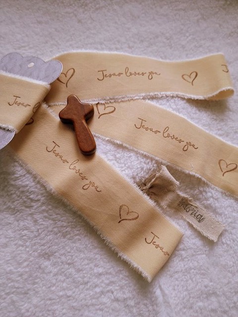 Kézzel festett és bélyegzett, tépett, pamutszalag, Bibliai, igés, felirattal- krém-019