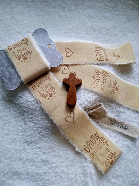 Kézzel festett és bélyegzett, tépett, pamutszalag, Bibliai, igés, felirattal- krém- 026