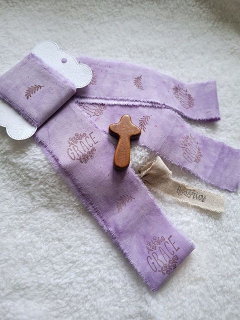 Kézzel festett és bélyegzett, tépett, pamutszalag, Bibliai, igés, felirattal- levendula- 027