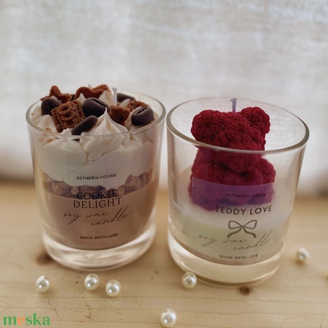 Kávé, Teddy macis poharas gyertya szett – Cookie Delight és Teddy Love, szójaviasz illatgyertyák