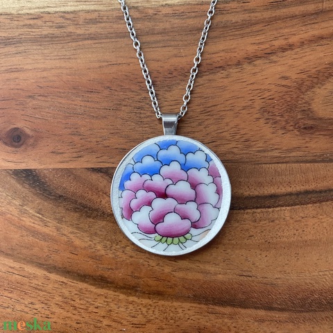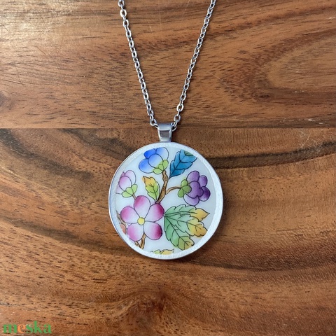 Mentett porcelán darabok - virágos nagy medálos nyaklánc - nemesacél