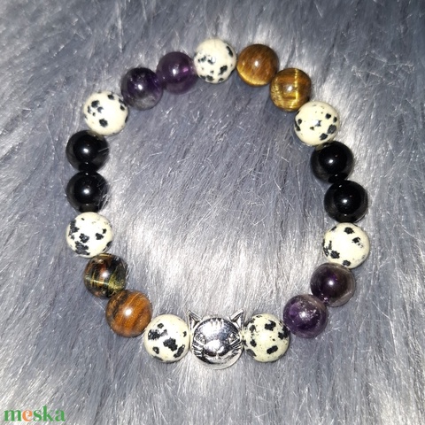 "Familiáris" Macska charmos ásványkarkötő dalmata jáspis, ametiszt, ónix és tigrisszem gyöngyökkel