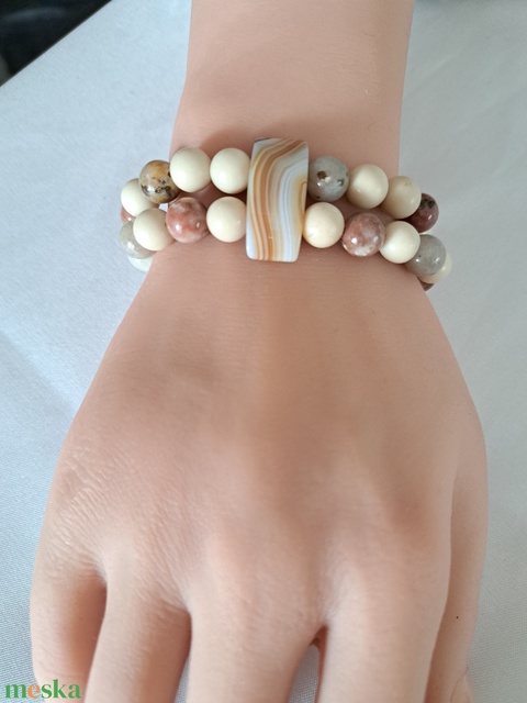 Elefántcsont jáde és szilvavirág jáspis karkötő achát pillérekkel