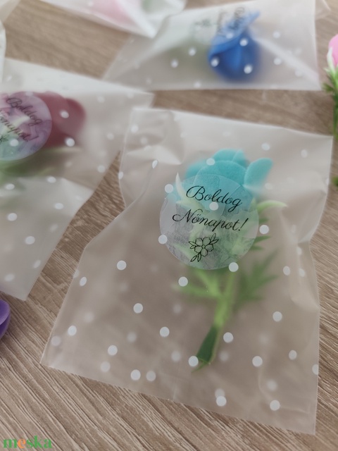 - Anyaga: habrózsa, műanyag szár, ajándék zacskó, felirat