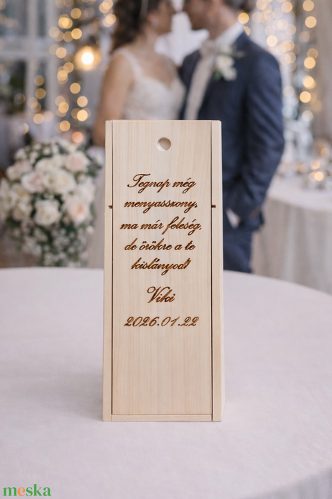 A személyre szabható névvel és dátummal ellátott doboz ideális választás édesapának vagy édesanyának, amikor a menyasszony vagy vőlegény szeretné megható módon megköszönni a támogatást, szeretetet és gondoskodást. A fadoboz belsejébe bor, ital, emléktárgy vagy személyes üzenet is elhelyezhető, így az ajándék nemcsak szívhez szóló, hanem praktikus is.