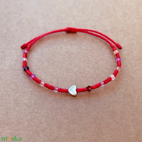 - Anyaga: viaszolt zsinór, ezüst színű fém szív gyöngy, matt üveggyöngy, csiszolt üveggyöngy