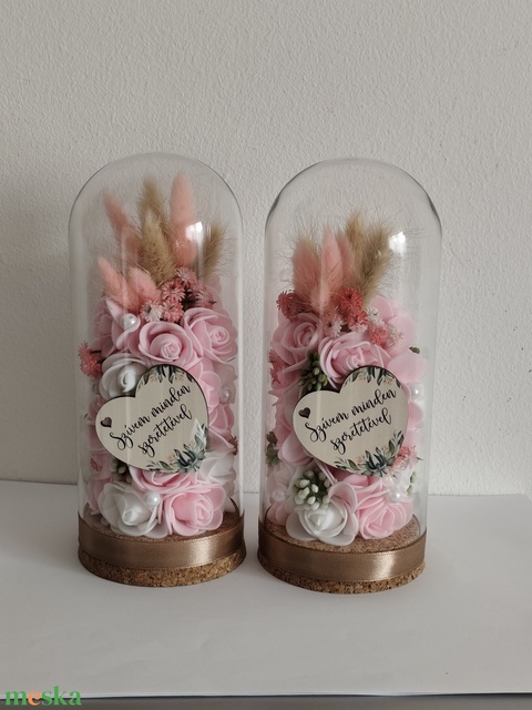 üvegbúra, polifoam virágok, fa felirat, dekorok