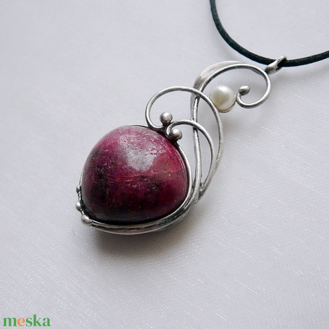 A medál Tiffany technikával készült rubin, réz és ólommentes, ezüsttartalmú ón felhasználásával. A díszítés szintén saját készítésű, nem tartalmaz gyári elemeket. A fémrészt óezüstre patináztam, lekezeltem antioxidánssal és lelakkoztam, hogy sokáig szép maradjon.