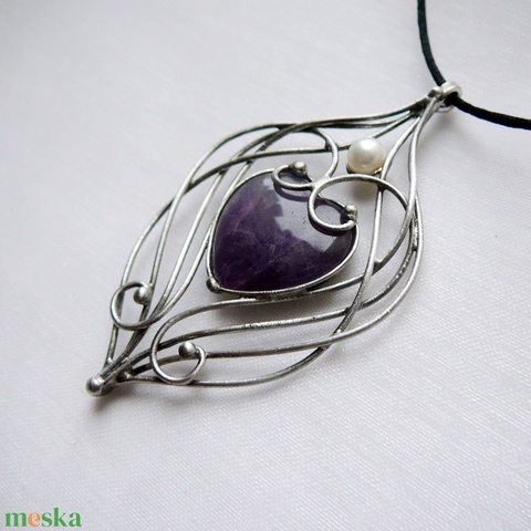 A medál Tiffany technikával készült ametiszt és ólommentes, ezüsttartalmú ón felhasználásával. A díszítés szintén saját készítésű, nem tartalmaz gyári elemeket. A fémrészt óezüstre patináztam, lekezeltem antioxidánssal és lelakkoztam, hogy sokáig szép maradjon.