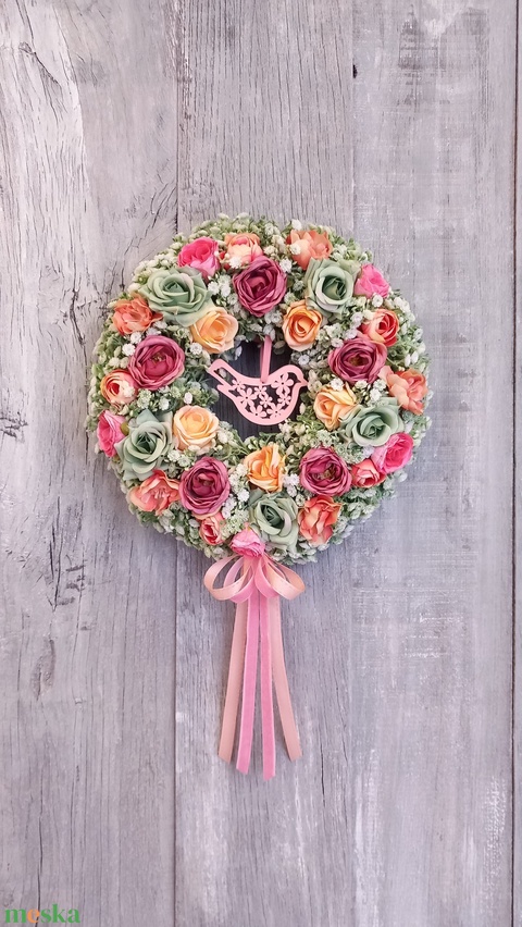 - Anyaga: művirágok, műzöldek, szalag, selyemvirágok, szalmakoszorú, kismadárdekoráció