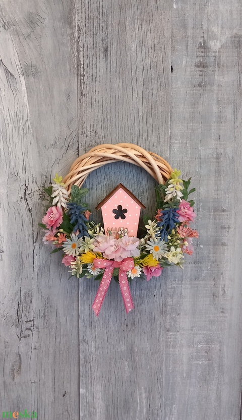 művirágok, műzöldek, vesszőalap, faházikó, szalag