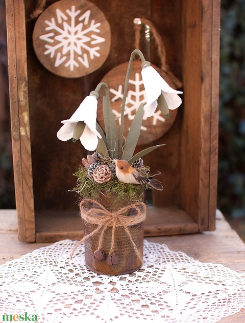 - Anyaga: tojástartó, konzervesdoboz, drót, festék, oázis, moha, termések, kenderzsinór