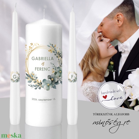 A központi esküvői gyertyán a pár nevei elegáns tipográfiával jelennek meg a virágkoszorú ölelésében, alatta az esküvő dátumával. A kísérőgyertyák monogramos díszítése visszaköszön a fő motívumból, így a teljes esküvői gyertya szett egységes, harmonikus látványt nyújt a szertartás során.