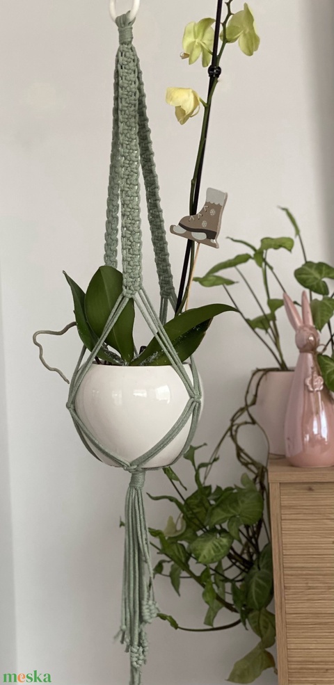 Virágtartó, makramé, almazöld