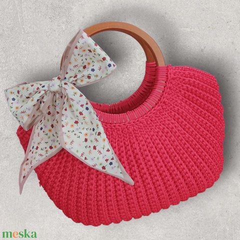 Gyönyörű,tűzpiros polyester fonalból készült. Kézi fogója ráhorgolt fa karika.Modern, kagyló formájú kézitáska. Igazi nőies darab, cserélhető selyem masnival. Tökéletes választás a mindennapokra vagy ajándéknak is kiváló!