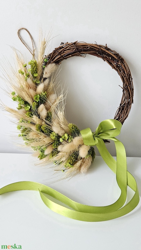 - Anyaga: vessző koszorú, száraz termések, szalagok, fa díszek