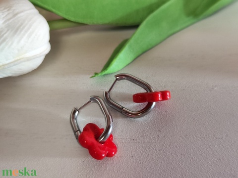 Nemesacél fülbevaló piros virág üveggyönggyel -16mm - Levehető gyöngy!