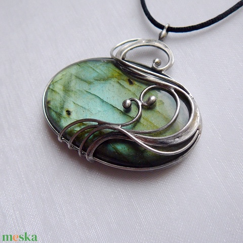 A medál Tiffany technikával készült labradorit és ólommentes, ezüsttartalmú ón felhasználásával. A díszítés szintén saját készítésű, nem tartalmaz gyári elemeket. A fémrészt óezüstre patináztam, lekezeltem antioxidánsal és lelakkoztam, hogy sokáig szép maradjon.