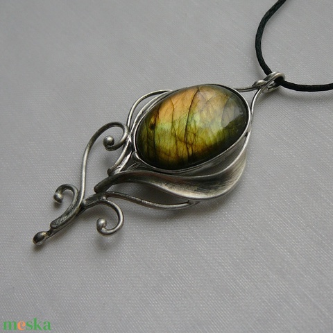A medál Tiffany technikával készült labradorit és ólommentes, ezüsttartalmú ón felhasználásával. A díszítés szintén saját készítésű, nem tartalmaz gyári elemeket. A fémrészt óezüstre patináztam, lekezeltem antioxidánsal és lelakkoztam, hogy sokáig szép maradjon.