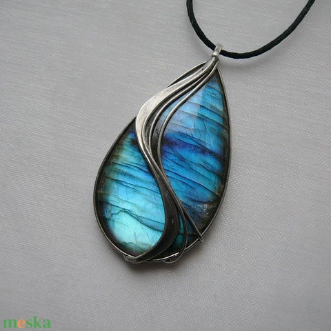 A medál Tiffany technikával készült labradorit és ólommentes, ezüsttartalmú ón felhasználásával. A díszítés szintén saját készítésű, nem tartalmaz gyári elemeket. A fémrészt óezüstre patináztam, lekezeltem antioxidánsal és lelakkoztam, hogy sokáig szép maradjon.