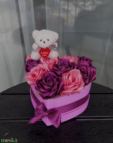 Macis szív-virágbox szaténvirágokkal