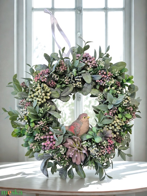 Bogyós tavaszi koszorú - kismadárral, természetes hatású