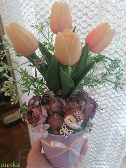 Asztali dísz őzikével élethű gumitulipánból