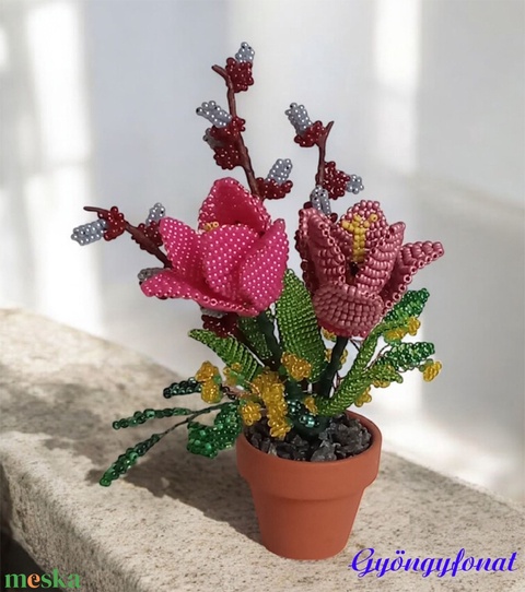 Gyöngyből készült tulipán, asztaldísz