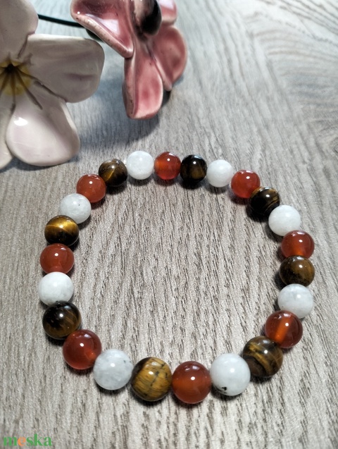 Női Ásványkarkötő - Fehér holdkő + Karneol + Tigrisszem