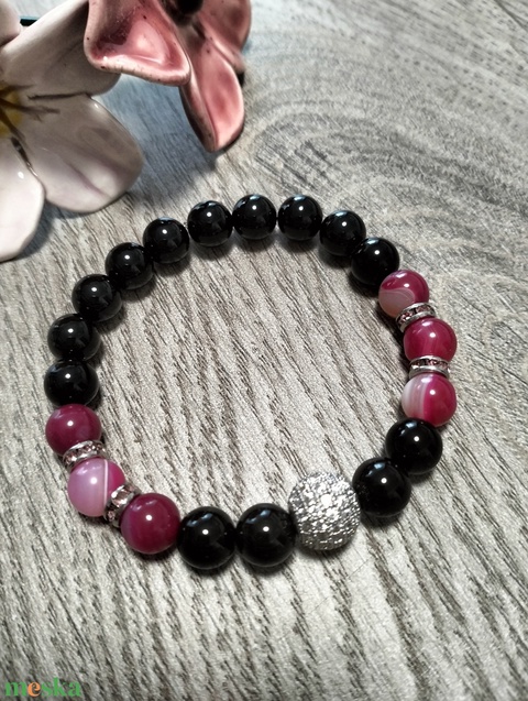 Női Ásványkarkötő - Pink achát + Ónix