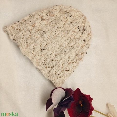 Nyers színű, moppos akril, áttört mintával kötött sapka