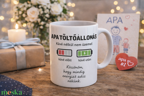 A bögrén szereplő humoros szöveg – „APA TÖLTŐÁLLOMÁS – Kávé nélkül nem üzemel” – egy látványos akkumulátor grafikával mutatja be a jól ismert állapotot: kávé előtt lemerülve, kávé után teljes energiával 😄 Az alsó, megható üzenet pedig igazán különlegessé teszi az ajándékot: