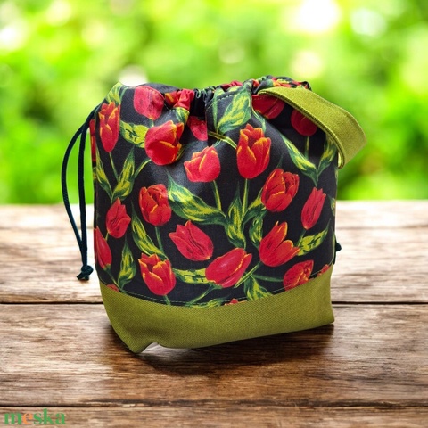 Fekete alapon piros tulipán mintás project bag – neszesszer és kistáska