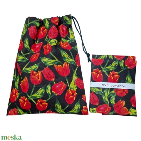 Tisztasági zsák és szalvéta (2db) szett, oviba, suliba, fekete, piros tulipános