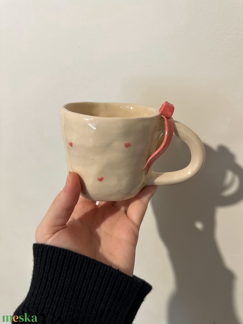 Egyedi, kézzel készült masnis, szív mintás bögre.