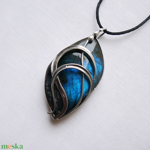 A medál Tiffany technikával készült labradorit és ólommentes, ezüsttartalmú ón felhasználásával. A díszítés szintén saját készítésű, nem tartalmaz gyári elemeket. A fémrészt óezüstre patináztam, lekezeltem antioxidánsal és lelakkoztam, hogy sokáig szép maradjon.