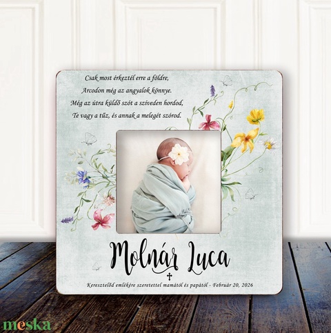 Modern, aranyos képkeret vadvirág mintával, tökéletes ajándék rokonoktól, keresztszülőktől, nagyszülőktől vagy szülőktől, amely sok-sok éven át megőrzi a keresztelő emlékét.