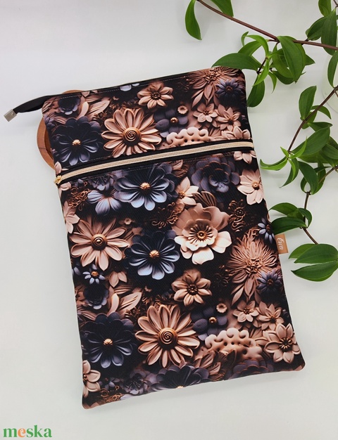 Cipzáros tároló - Laptoptartó, barna, szürke virágos