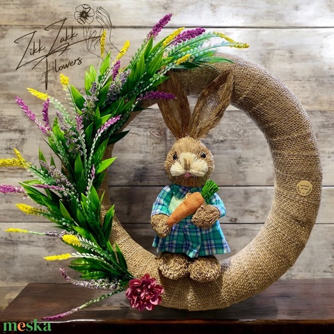 - Anyaga: szalmakoszorú, szalma nyuszi, örök virágok